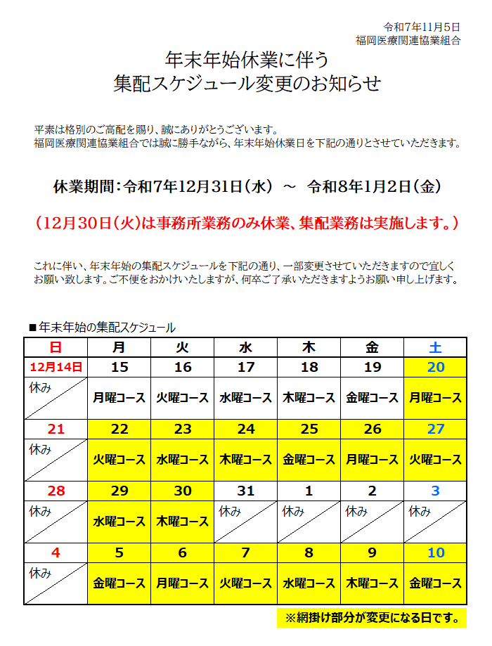 年末年始休業に伴う 集配スケジュール変更のお知らせ